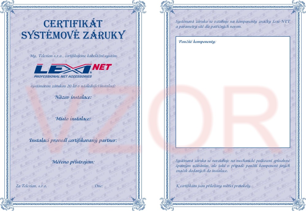 Pro kabeláž Lexi-NET je možné získat systémovou záruku 20 let. Společnost, která bude instalaci provádět musí být vyškolena a být