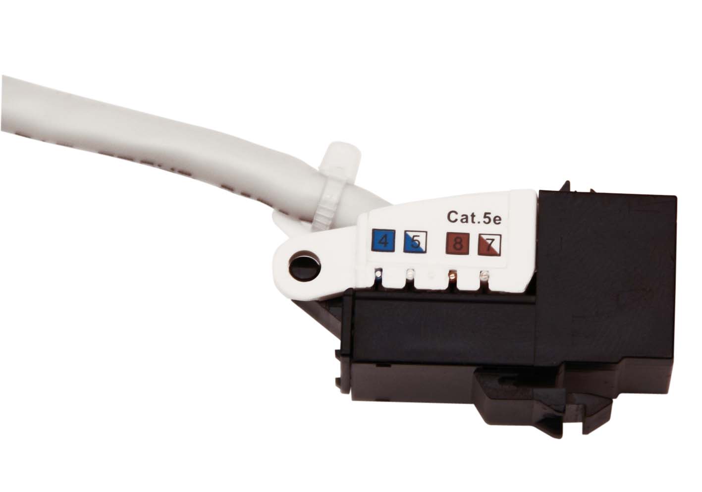 Keystone Cat 5e UTP, použití pro neosazený patch panel, zásuvky LE307K-2, ABB Tango, Time, Swing atd. Jsou vybaveny fixováním kabelu stahovacím páskem. |